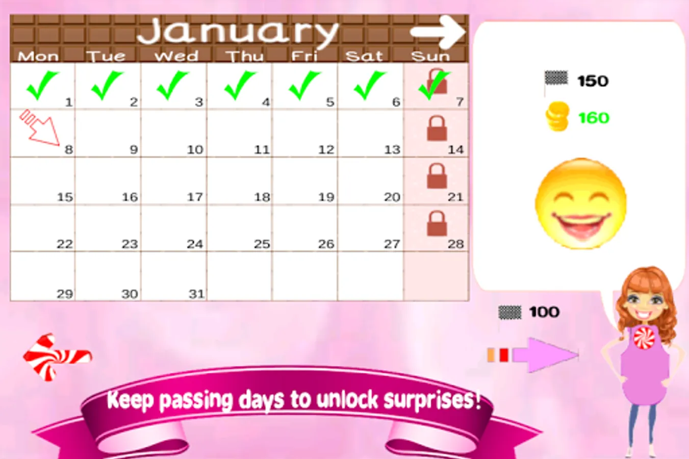 -Help princess Tracy manage your store. The calendar marks your progress. Pass to the next day by reaching the daily money goal to win more candy!
