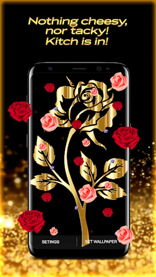 special “gold roses wallpaper app”! Give a new, pleasing look to your Android™ device! It's time for beauty, fortune, kindness & happiness! As a flower lover, you should recognize the floral potential of this goldie! Nothing cheesy, nor tacky! Kitch is in!