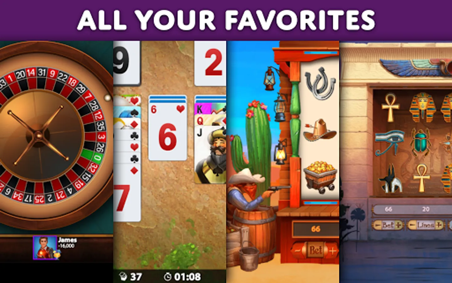 Play all of your favorite casino games including hot Vegas slots, poker, blackjack, bingo, roulette, solitaire, video poker, card games and a variety of lottery and scratcher games. All games have exciting online multiplayer features like you won't find anywhere else. New games are being added all the time!