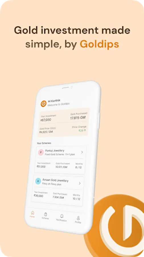 A well-organized platform to manage your gold saving schemes joined from your favorite jeweler, Track all your payments, invested amount, and gold price in goldips