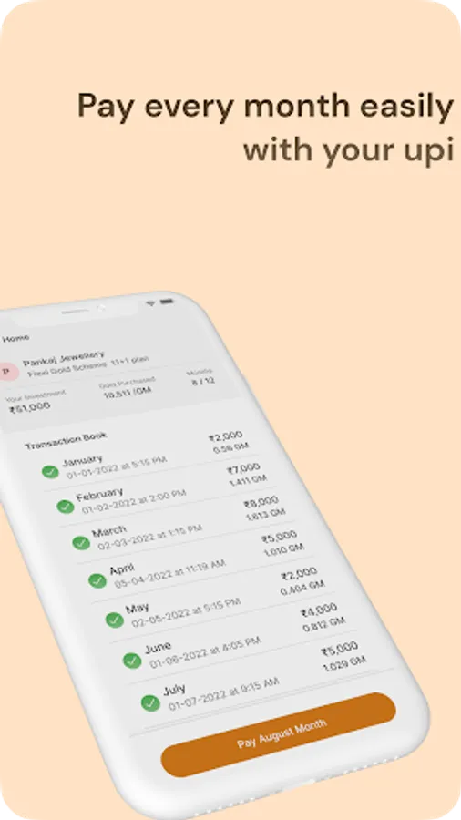 - You can check the current gold rate and pay your gold saving scheme through our app via UPI, And track all monthly payments and pending transactions.