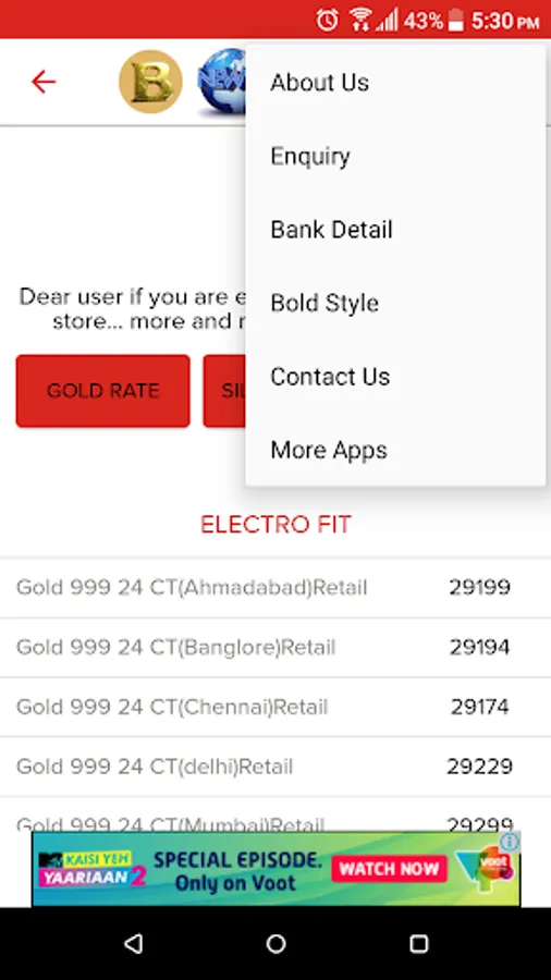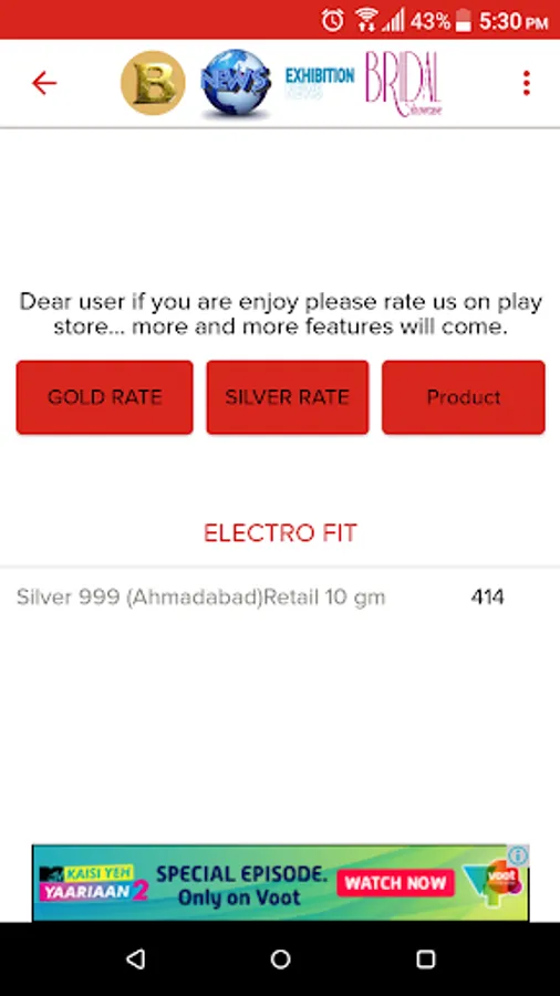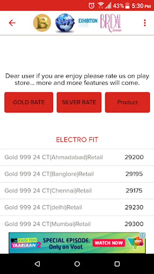 This is a Live Rate Application which provides the Spot Rates for Gold and Silver, USD / INR and International Gold, Silver rates