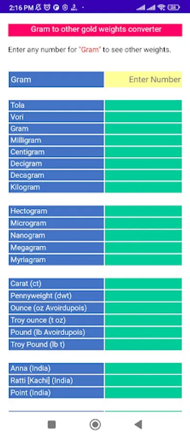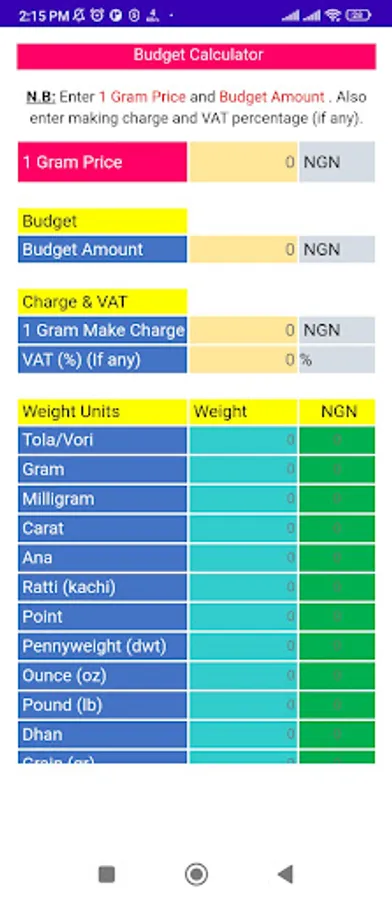 - Enter jewelry weight amounts in different units and calculate the total price with making charge and VAT.