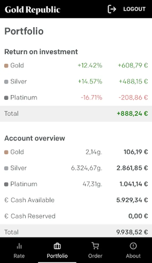 GoldRepublic Mobile equips you with an unparalleled trading experience. Swiftly execute buying or selling orders, conduct seamless portfolio reviews, and stay updated with the latest market news about gold and silver. Our real-time Performance feature keeps you abreast of your precious metals' current worth and your portfolio's long-term performance.