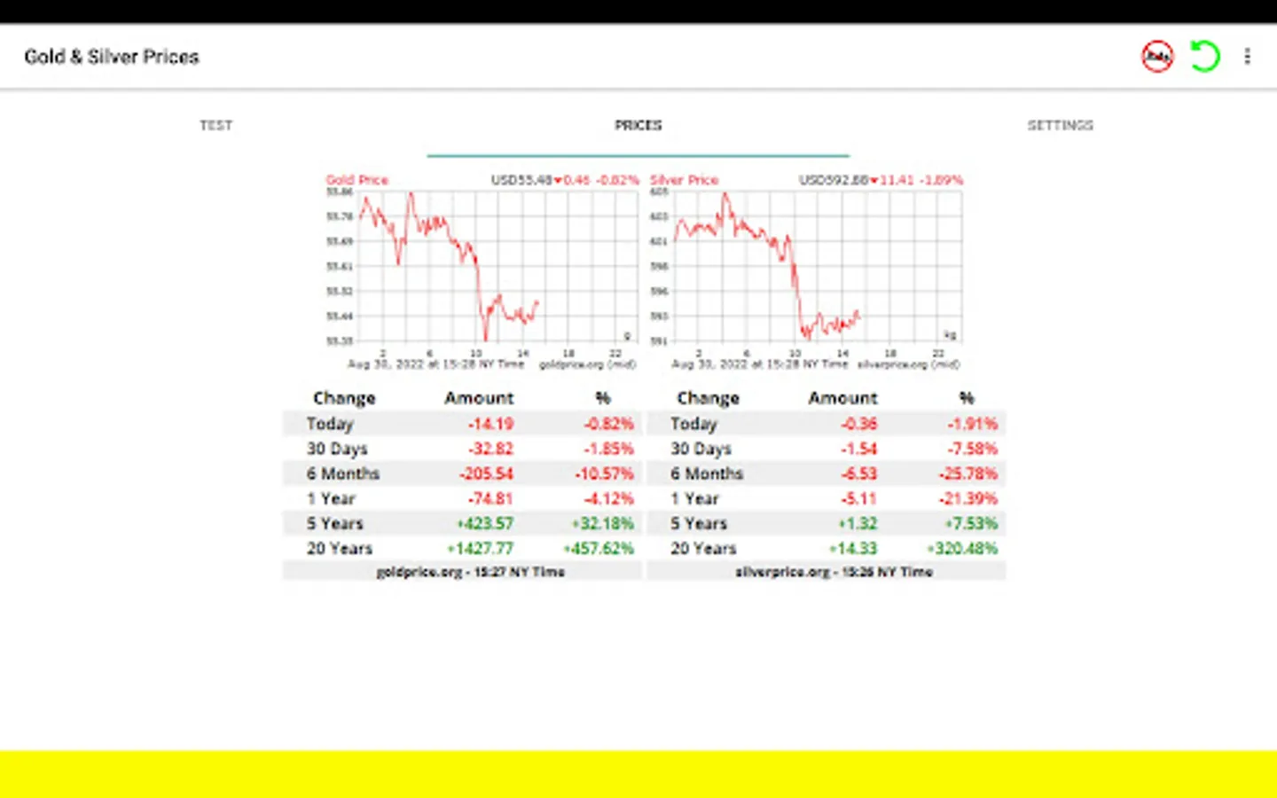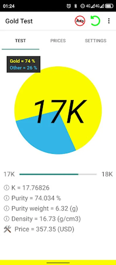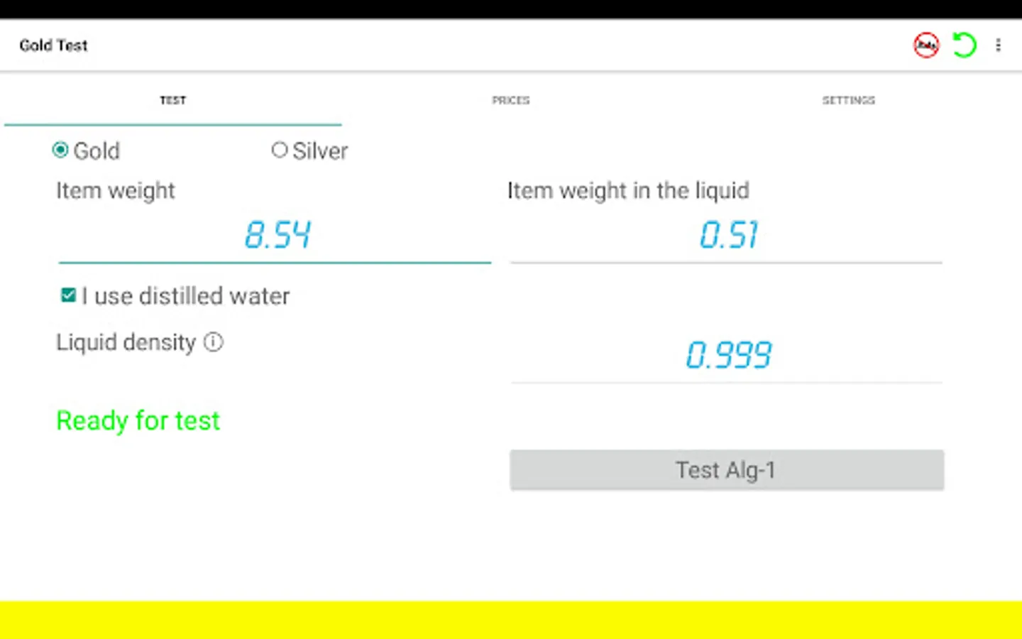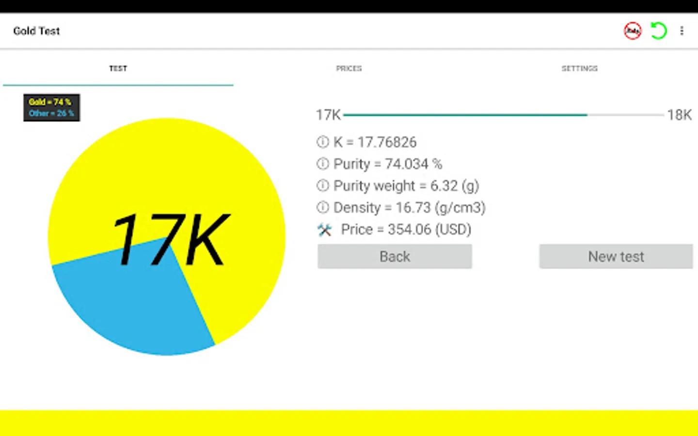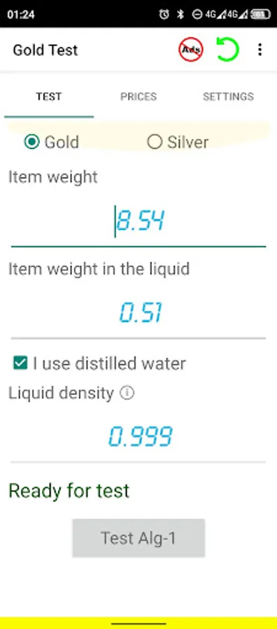 Welcome to Gold Test + app. This app is the cheapest and easiest way to determine gold & silver items purity! Best choice for your business! Using this app you will easily perform gravity and density test calculations. You will be able to test full volume of golden ans silver items without damaging or cutting them. Be protected from buying fake gold. Also, app will provide you exact price of tested item. Also you can follow real time online gold and silver prices provided by www.goldprice.org . App interface includes more than 50 languages. Prices provided on more than 145 currencies. Please watch introducing video, you will find answers on your questions. We are sure that you will be amazed how useful will be this app for you!