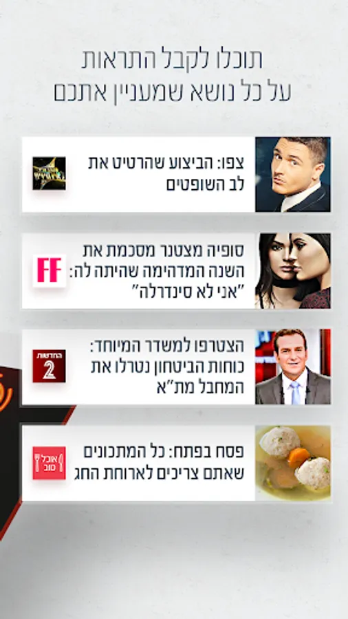 הישארו מעודכנים בכל רגע עם מבזקי חדשות 12, ידיעות מעולם הבידור, הספורט, הלייף סטייל והמוזיקה לצד תכניות קשת וערוצי תוכן נוספים.