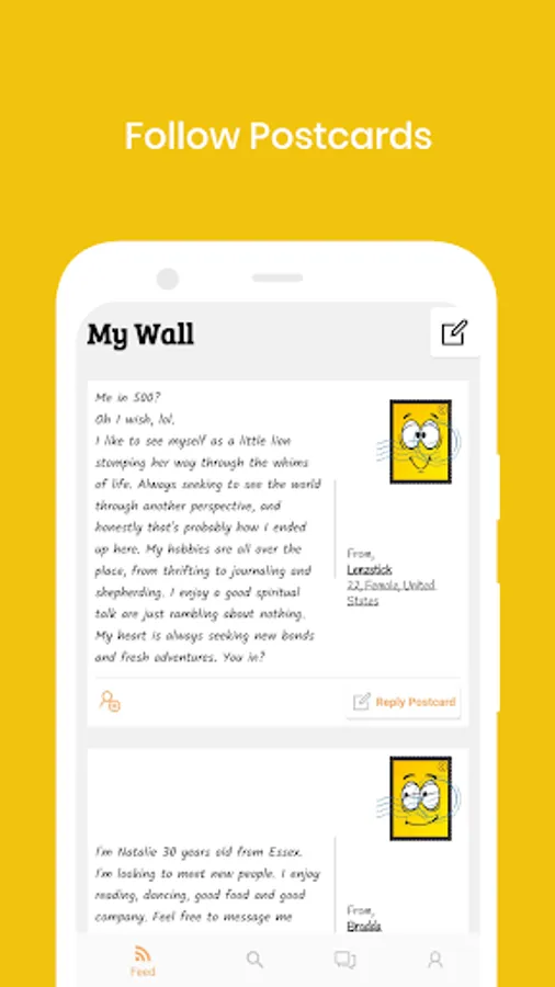 Presenting GoLetters App, a place where you can express your day without the fear of being judged. Share your today's experience in a postcard and find someone who resonates with you. Follow and Exchange postcards anonymously without worry and build your friends/penpals group.