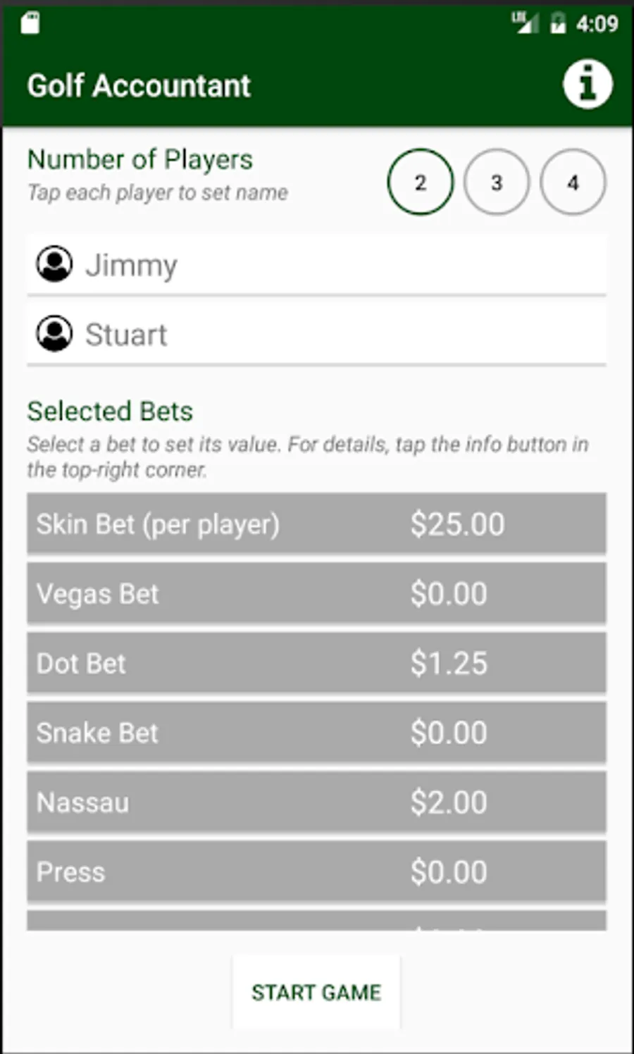 To use the app, you simply select the number of players (2-4), enter their names, and assign a bet value for each of the desired bets. You can choose to use any or all of the bets, and the Golf Accountant will automatically calculate the results as quickly as you enter the scores.