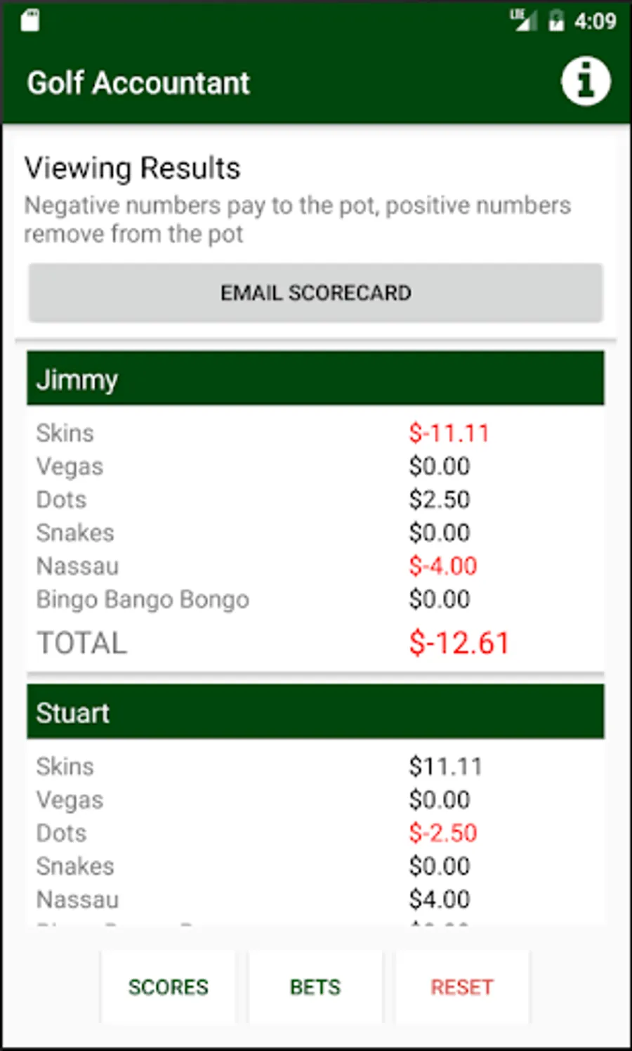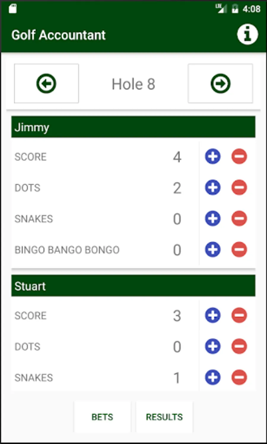 After each hole, enter each players score, along with any dots, snakes or Bingo Bingo Bongo for the hole and the app will automatically calculate the win/loss statement for each player on the results tab. You can access the results tab at anytime should a player want to know their current status.