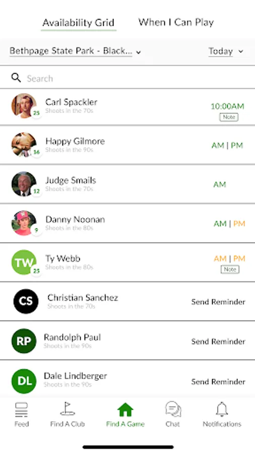 • Our exclusive Availability Grid shows you at a glance when your friends, and everyone else at your favorite courses, can play. They can see when you can play, too.