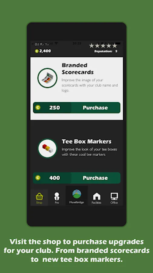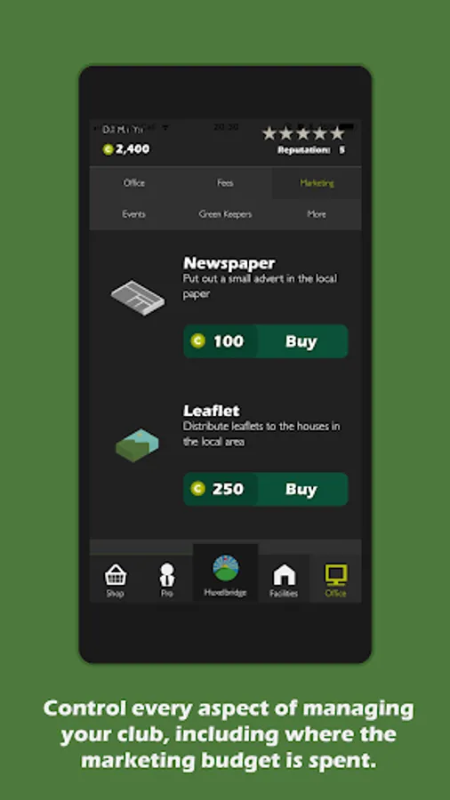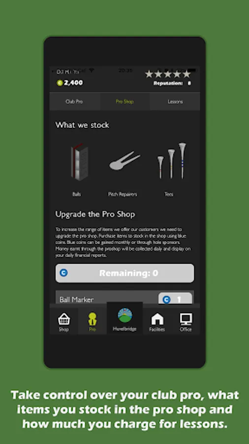 The owner; James, is handing you complete control of running his dwindling golf club. He is relying on you to turn the place around and turn each day in to a profitable one. Help him to achieve his dream of being the owner of a championship golf course. Use skill and strategy to capitalise on each day's earnings, and see if you've got what it takes to become a top golf club manager!