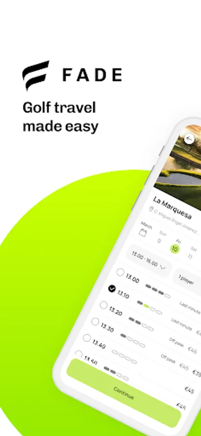 Say goodbye to the hassle of booking tee times for your golf trips. Forget tedious manual bookings, inflexible package options, extra costs, and limited availability. It’s time to reinvent how you discover and book your golf courses. With Fade, effortlessly book tee times and purchase green fees on over 1,000 golf courses across 30+ countries. Perfect for the travelling golfer, Fade lets you reserve, pay, and even invite fellow players—all from your mobile device, 24/7. Whether you're eyeing a challenging links course abroad or a scenic resort course for your next holiday, Fade has you covered.