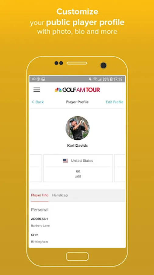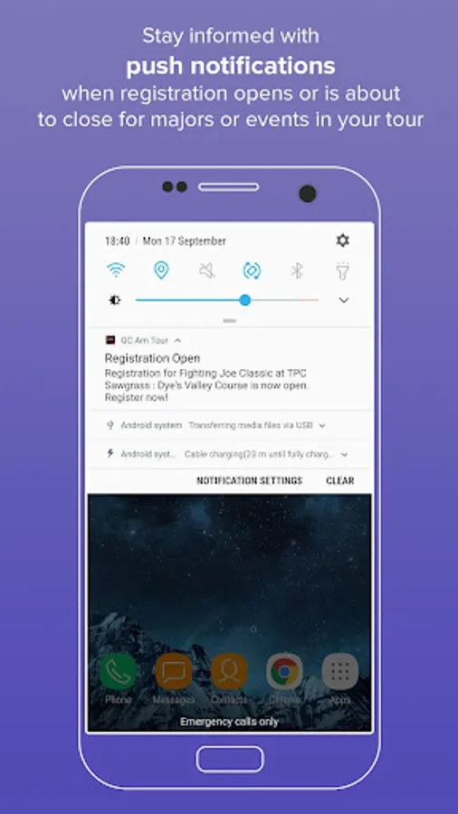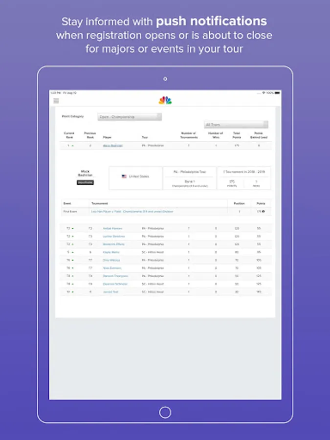 - Push notifications alert golfers when registration opens or is about to close for tour events or majors.