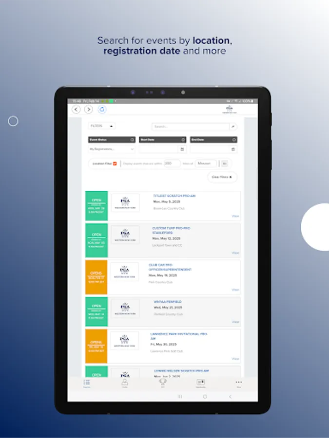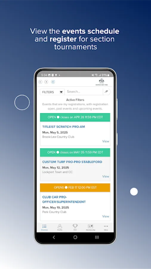 - Golfers can review the events schedule and quickly register for events.