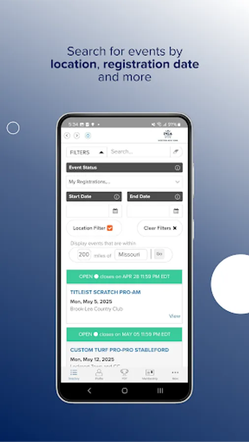 - Push notifications alert golfers when registration opens or is about to close for association events.
