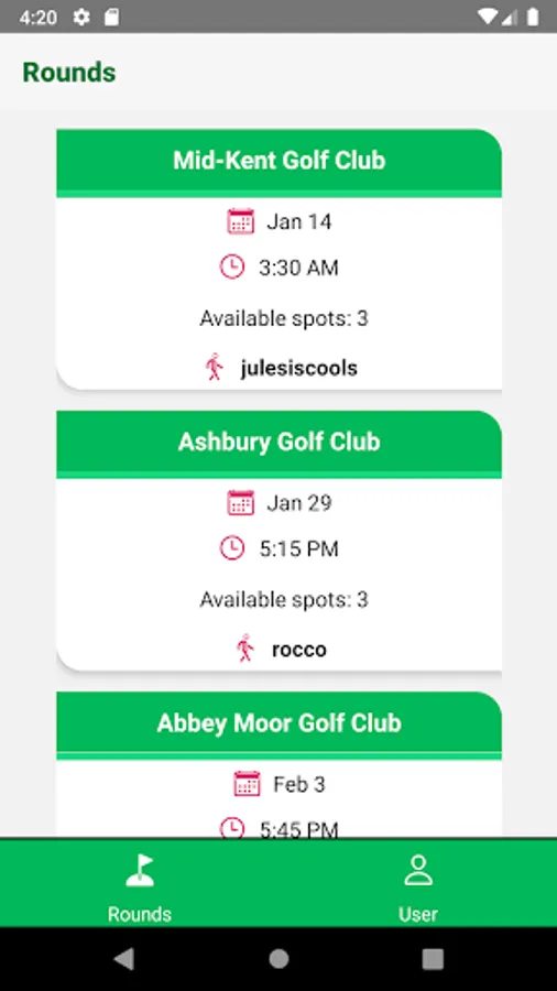 This app allows you to create or join rounds of golf. Simply find and join a round of golf near you. Alternatively, create one and wait for other players to join it.