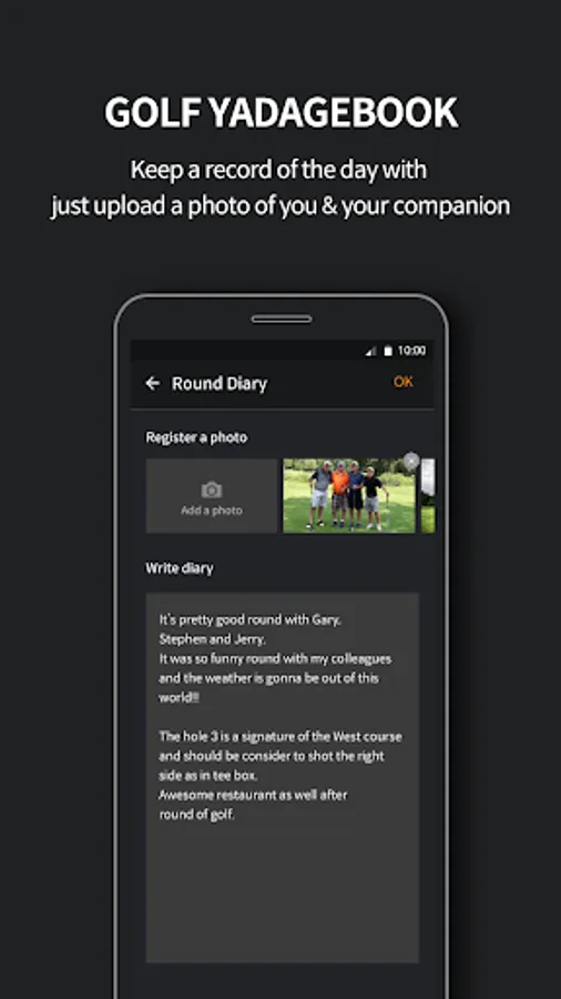 The HD yardage book guides you to make precise shots and can register shot position as well as check distance. Furthermore, the round diary that you freely write down things provides to remember precious moments for a long time.
