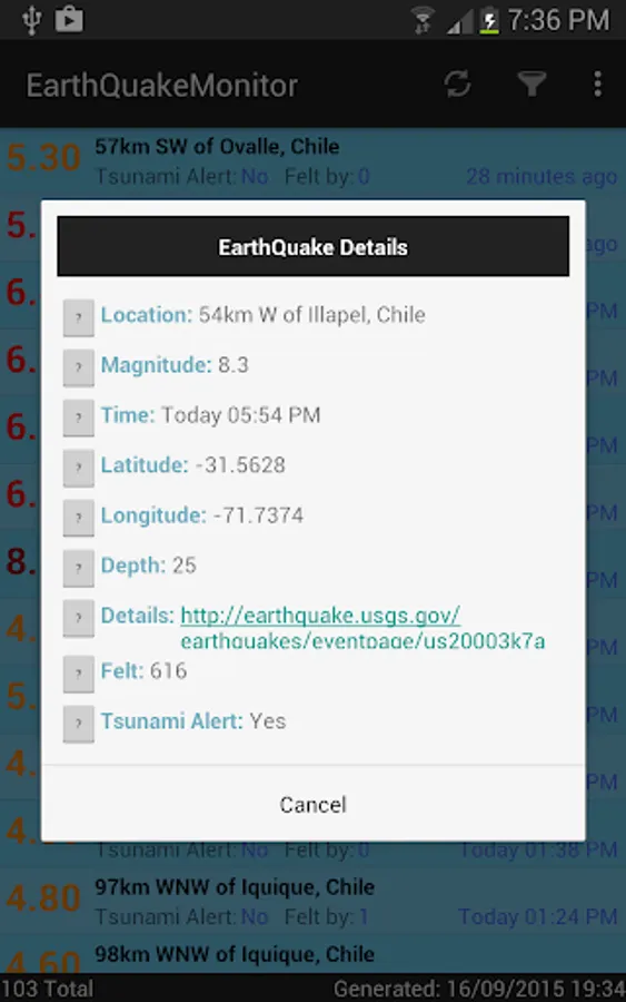 It is posible also to see if there is a tsunami alert. Is important to note that a tsunami alert does not imply that a tsunami in fact will occur, in fact alerts are generated and canceled frequently.