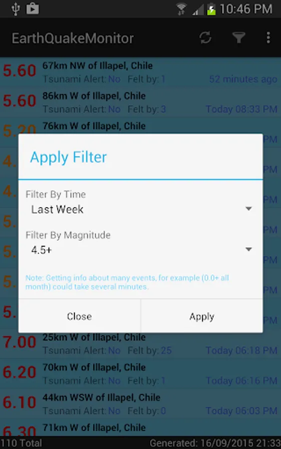 Now you can also filter the earthquakes by distance between you and the epicenter.