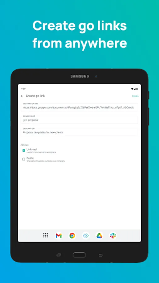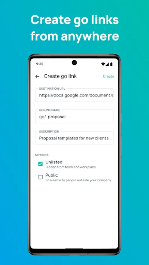 Create new go links from the mobile application as you would on your desktop browser. Now, resources accessed on your phone can be quickly converted into convenient go links.