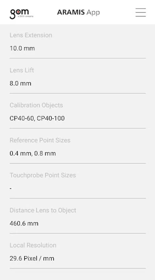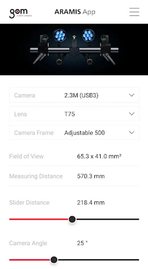 GOM’s free ARAMIS App is the perfect app for a versatile measuring system, letting you plan measuring tasks quickly and reliably and giving you more time for those high-precision motion and deformation analyses with your ARAMIS system. The app computes the required sensor settings, such as measuring and camera distances, and provides all the data you need for an optimum setup. You can also see which reference points and GOM Touch Probes you can use.