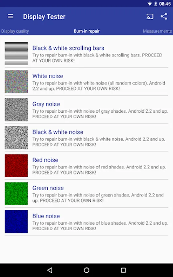 DisplayTester makes it possible to test almost every aspect of your device's LCD/OLED screen. Using Google Cast it is possible to test the display quality of your TV. It is designed to allow full screen testing also on devices with soft keys (hiding the soft keys in ICS and later, immersive mode in KitKat and later).