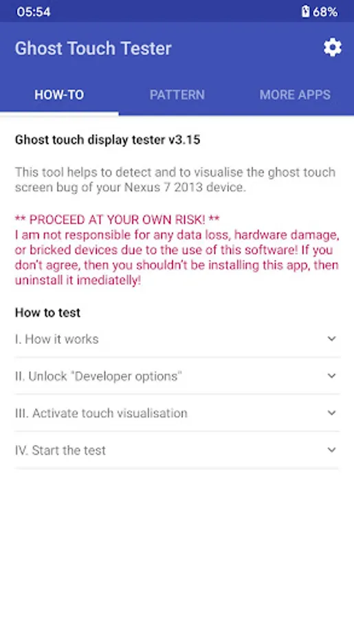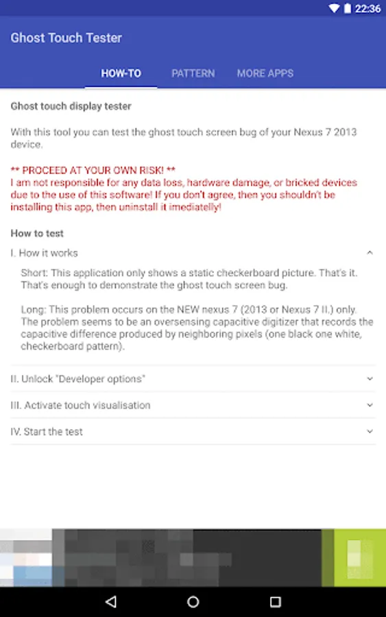3.) Start the test by selecting a pattern. The pattern is visualized in the left upper corner. Not all pattern cause fake touches. One pattern can cause fake touches in landscape mode but not in portrait mode or vice versa.