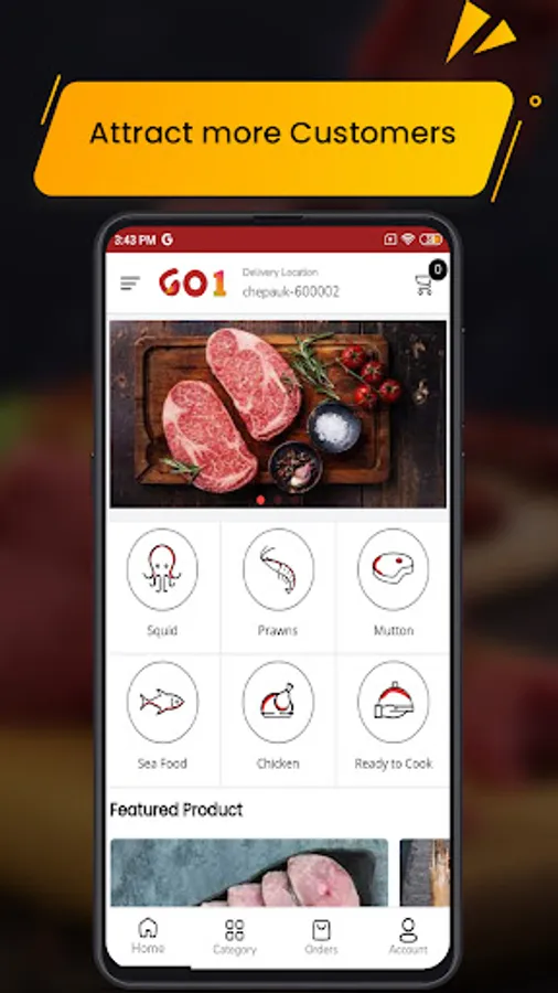 Perfect E-Commerce App for meat business (DEMO). Enhance your business with Go1 Meat's customer ordering app with custom features such as unlimited product management, discounts and offers, secure payment options, convenient delivery time slot selecting, etc boost your customer shopping experience.