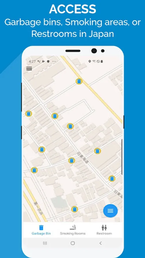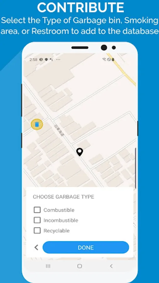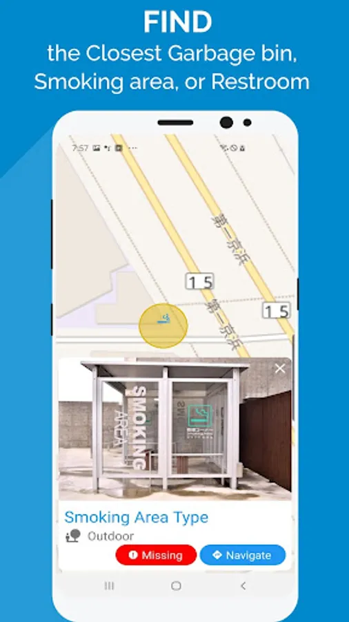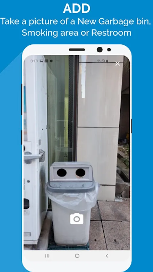 Help other tourists by adding a new garbage bin, smoking area, or restroom into the app's database.