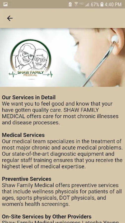 At Shaw Family Medical, our goal is to serve the community by providing outstanding healthcare to our patients through our small town attitude of qualified compassion and professional responsiveness. We pride ourselves on the personal relationships we establish with our patients as well as the comprehensive services we provide in the specialty of Family Medicine. Our practice is open to patients of all ages, from 6 weeks old and up.