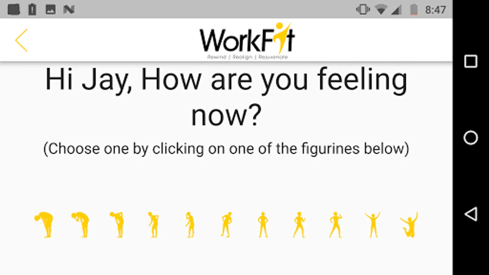 Employees perform a series of movements without having to change their work clothes. Simply enter the kiosk and answer a few questions, and get ready to experience the rejuvenating effects of WorkFit!