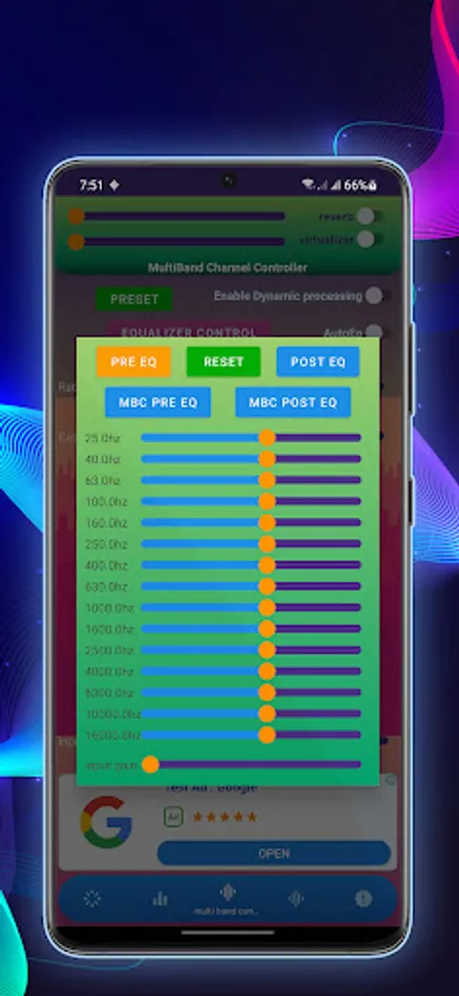 - 10 / 15 Band dynamic Equalizer (pregain, postgain).