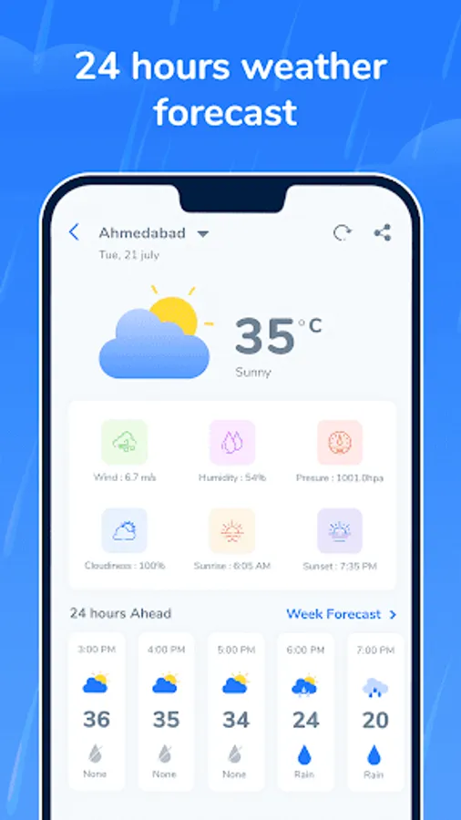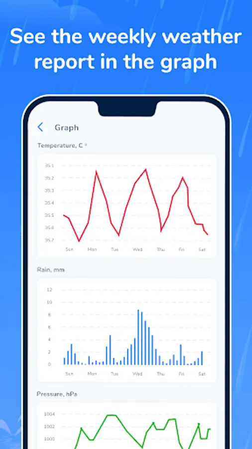 - You can vie week's weather graph like temperature, rain, snow, etc