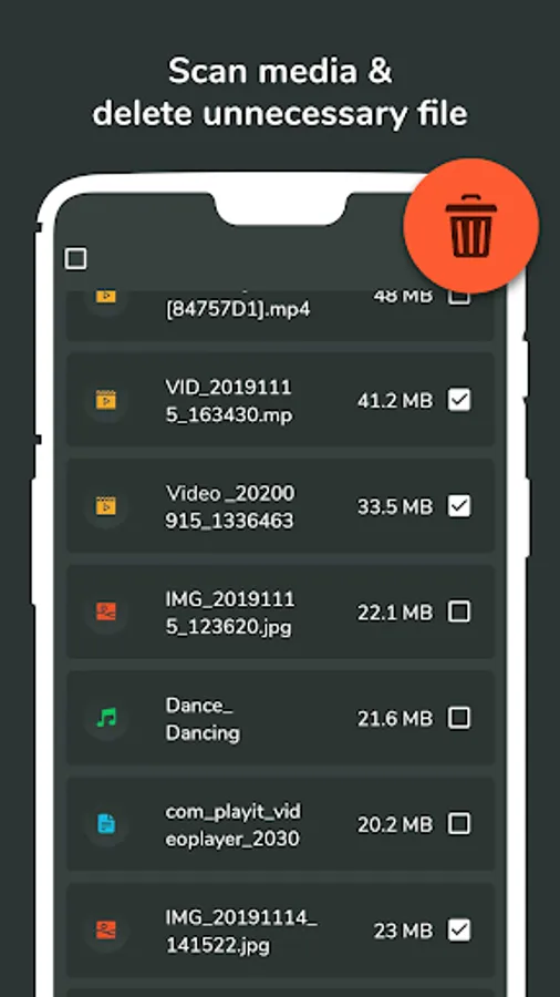 Super Scanner: allows you to scan all the large files ( Photo video or other files ) present in your mobile. Using super scanner you can identify large files so that you can delete the unwanted large files to create ample of space in your mobile.
