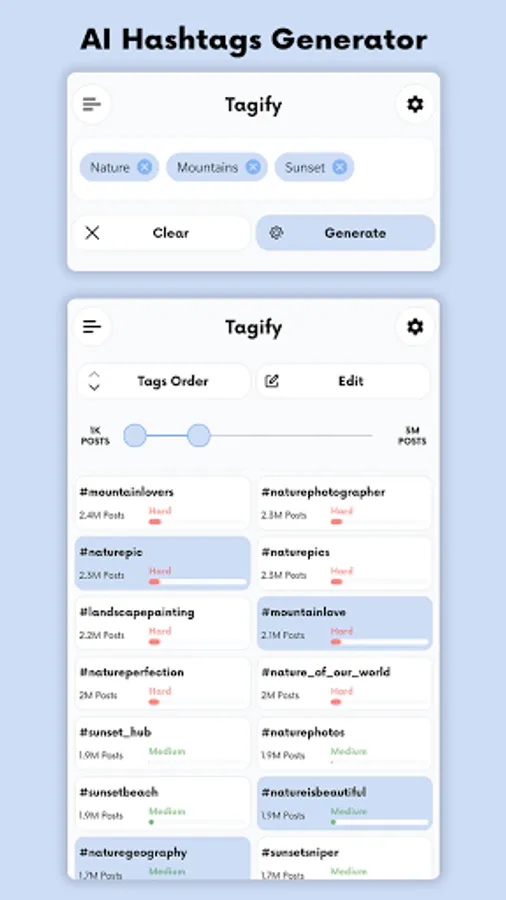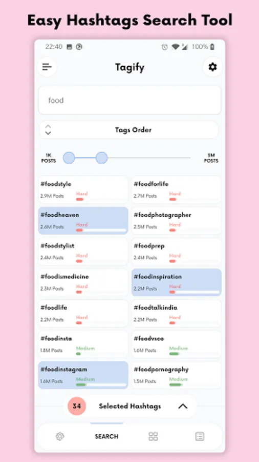 + You can search easily to find the most relevant hashtags of the moment related to your posts