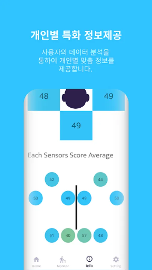기기와의 BLE 통신을 이용한 실시간 수치 확인을 경험하세요. 당신의 자세가 바뀌는 만큼 각 센서의 색상과 좌우 균형을 나타내는 그래프가 실시간으로 당신의 현재 상태를 반영하여 나타내어 줍니다.