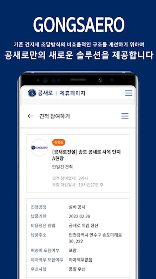 Gongsaero users can procure construction materials for timely delivery based on site location / item / evaluation, and construction material suppliers can manage on-site information and material inventory risk.