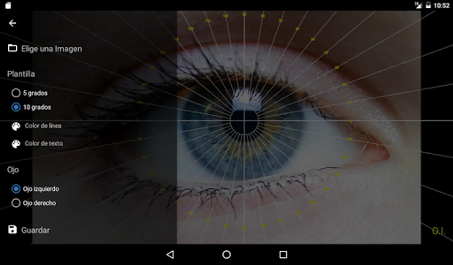 Goniotrans is a simple, free and useful to reference an image of the eye on the angular position of the ocular structures tool. You capturing a photographic image of the eye is copied and pasted into the program which overlaps a template that simulates a conveyor with two hemi-meridians superimposed with marks from 0 ° to 180 ° in steps of 5 ° or 10 °.