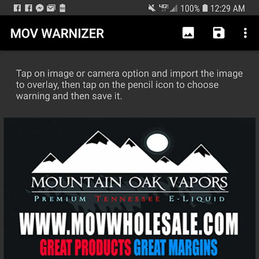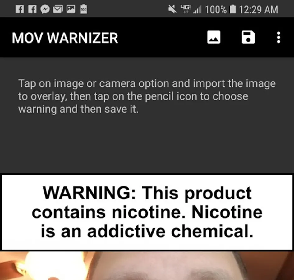 This app was developed to handle compliance issues related to FDA regulations in the Electronic Cigarette industry. Using this app will allow the user to take pictures with their phone camera, or load them from their gallery and apply the federally mandated 'NICOTINE WARNING' with some options.
