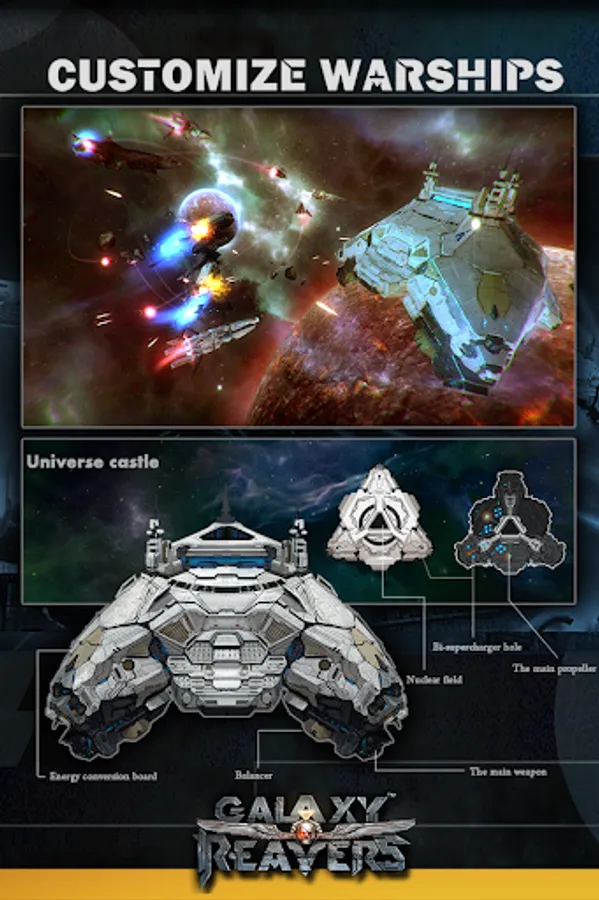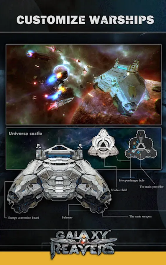 There are 8 types of ultimate warships to collect and use in your fleets. Think wisely as this choice will change everything in Galaxy Reavers!