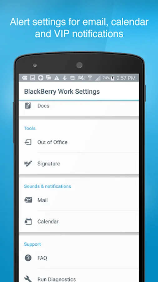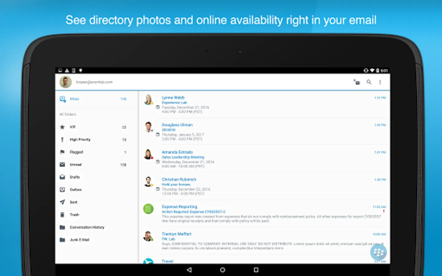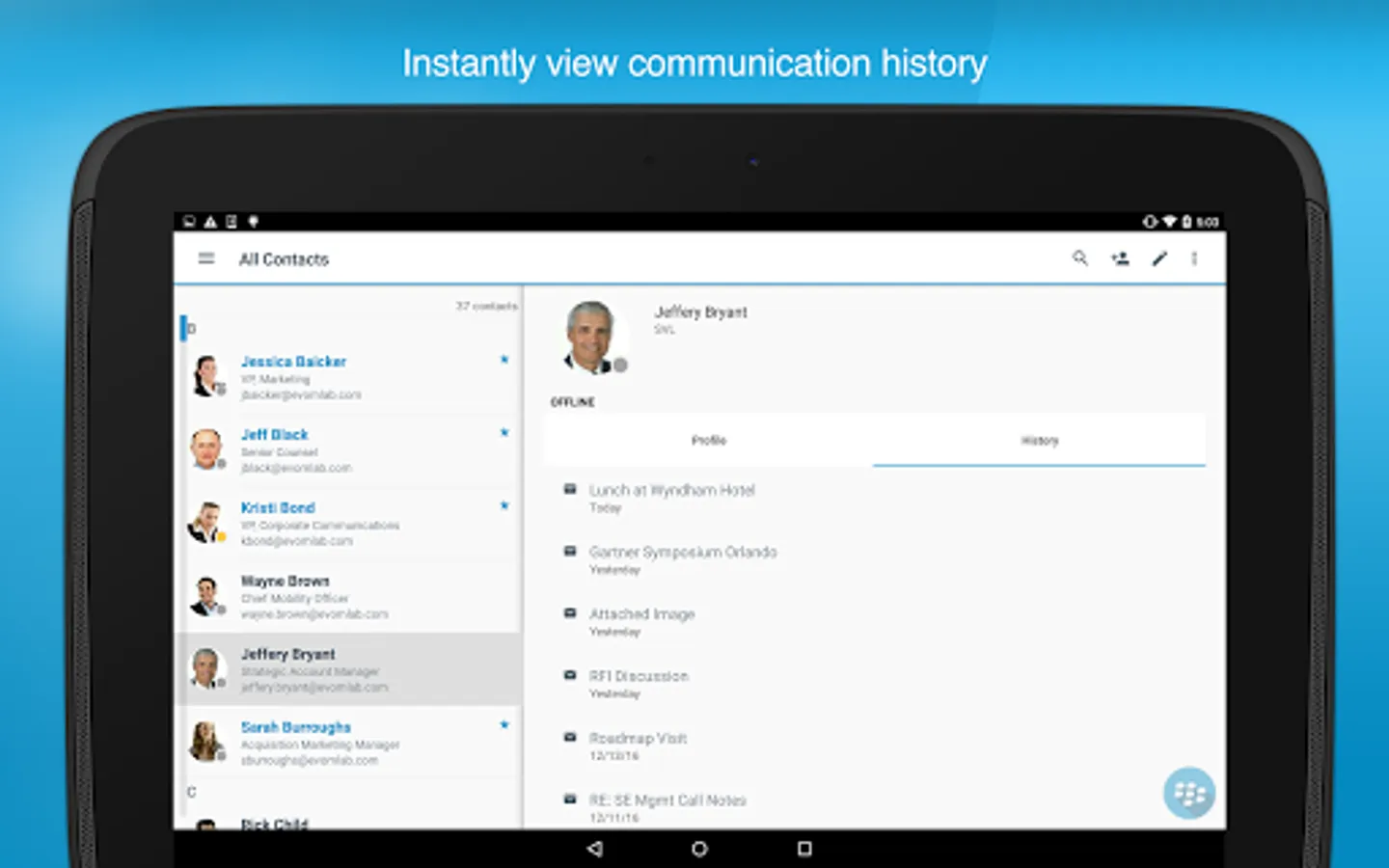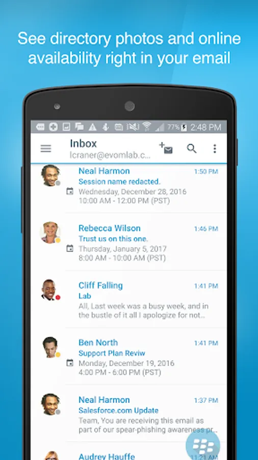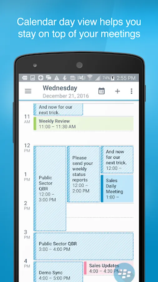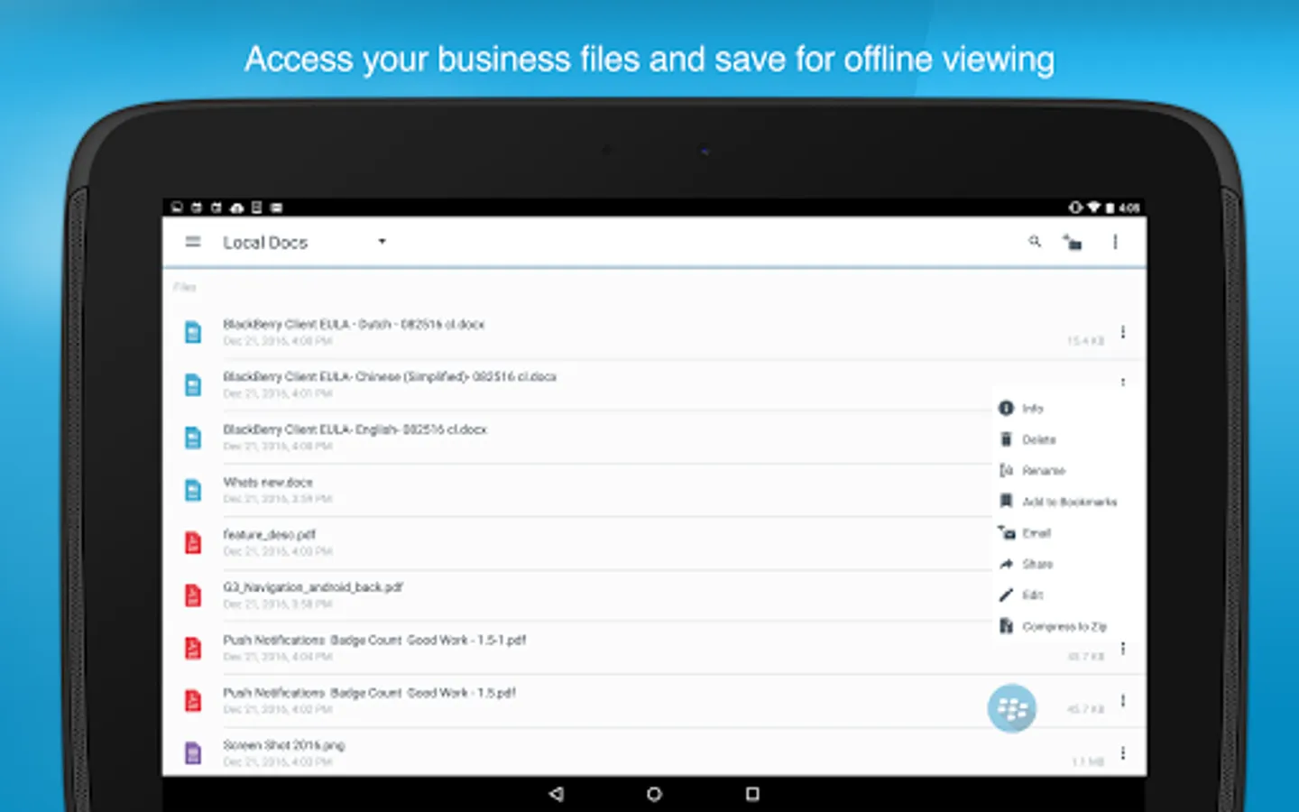 Take care of business simply, elegantly and securely with BlackBerry Work. Stay on top of your business email, schedule and join meetings, and manage your contacts with an easy to use, all-in-one app.