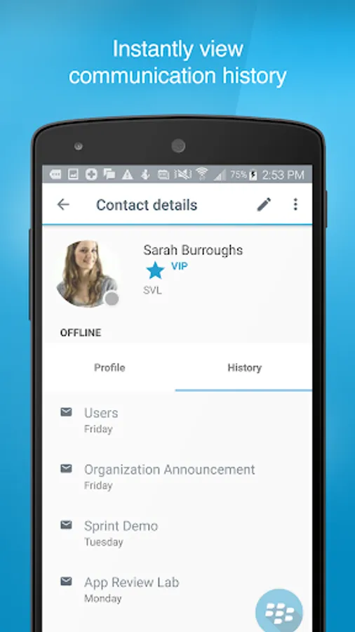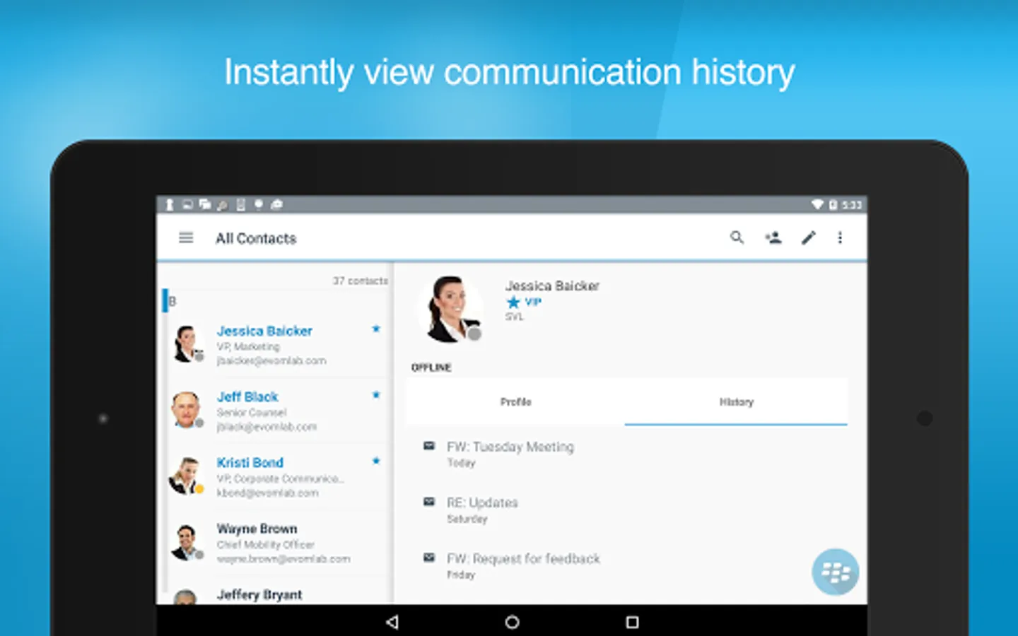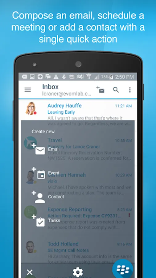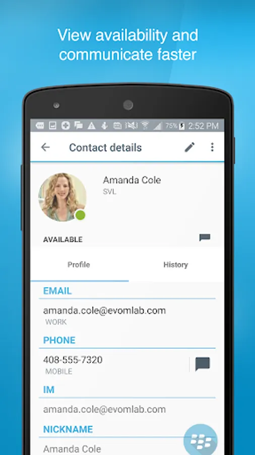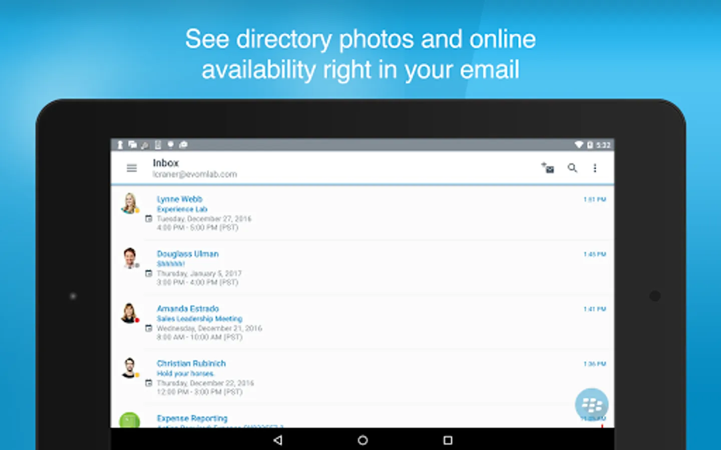 BlackBerry Work delivers a personalized business experience. See your colleagues’ photos in your email. View online availability to chat everywhere you work - in email, a calendar event and on their contact card – a capability unique to BlackBerry. Quickly navigate among your business apps using Launcher. Switch easily between composing an email, adding a contact, or scheduling a calendar event with quick action buttons. And always know that your personal privacy is protected without intrusive geo-location capabilities.
