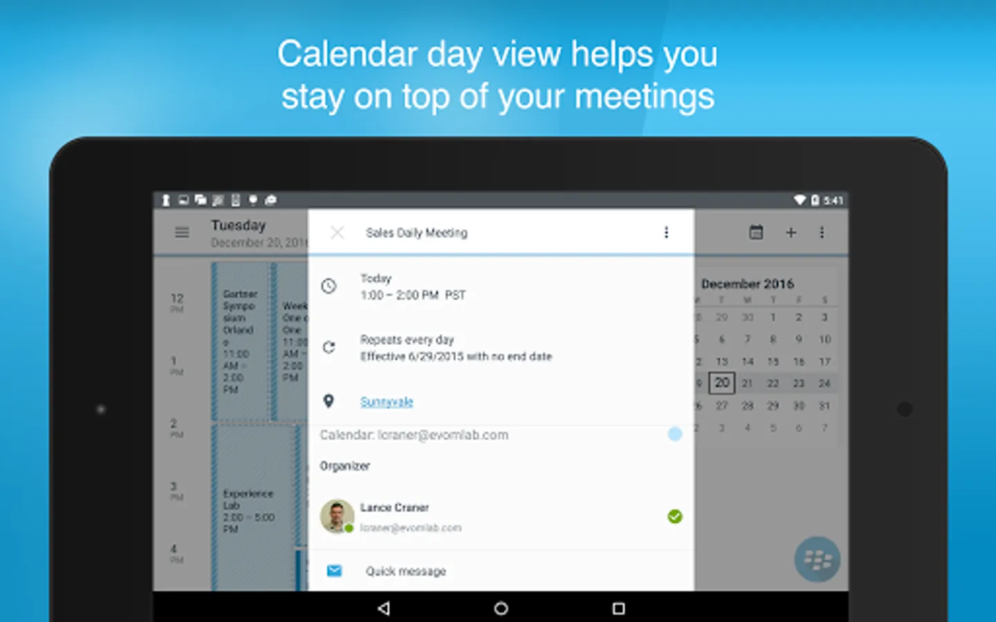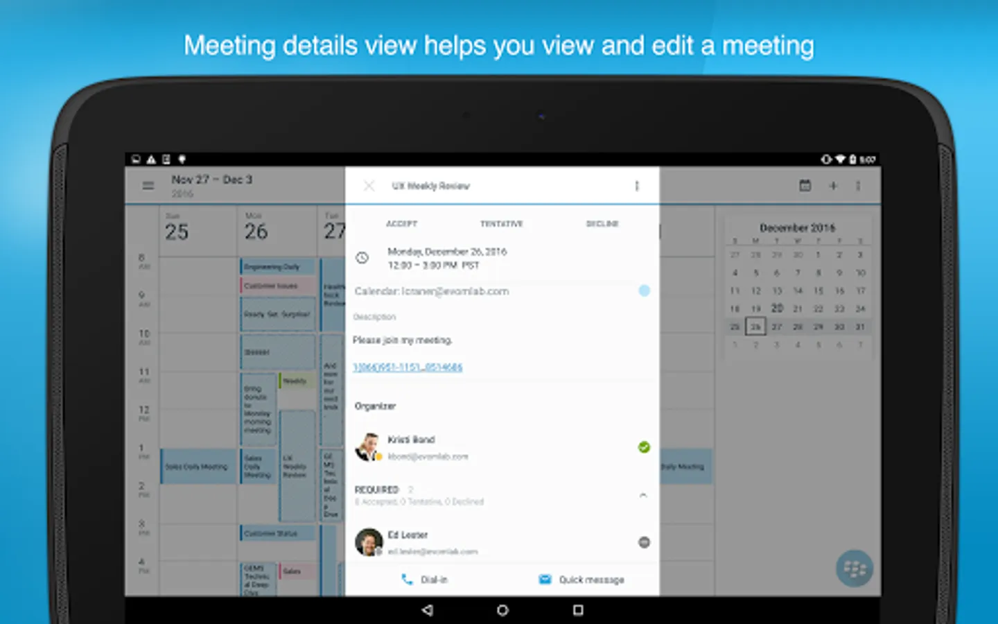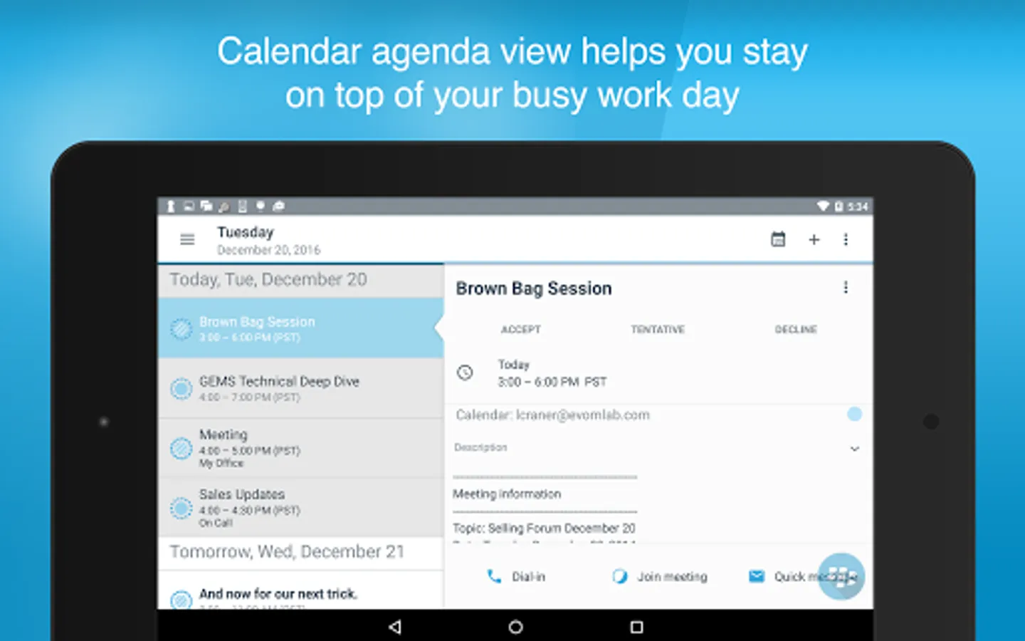 • Calendar: Stay in touch with your colleagues, customers and partners wherever you are. Join meetings or schedule new ones. Even send a quick reply message if you are running late.