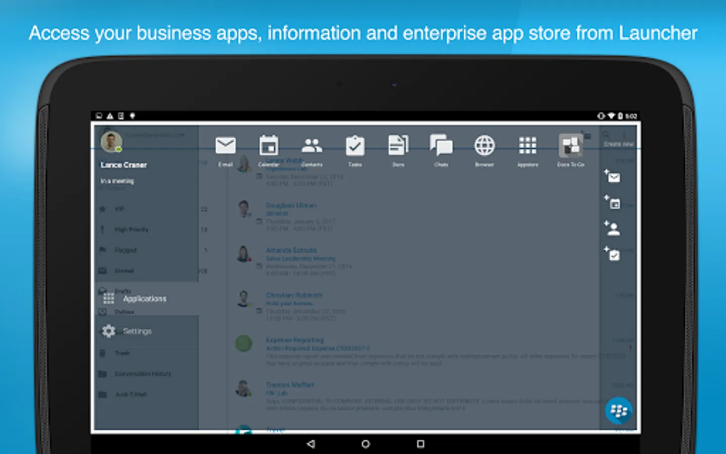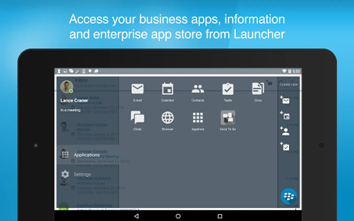 • Launcher: Simplify multi-tasking and app navigation with easy switching between your email, calendar, contacts, app settings and other BlackBerry apps.