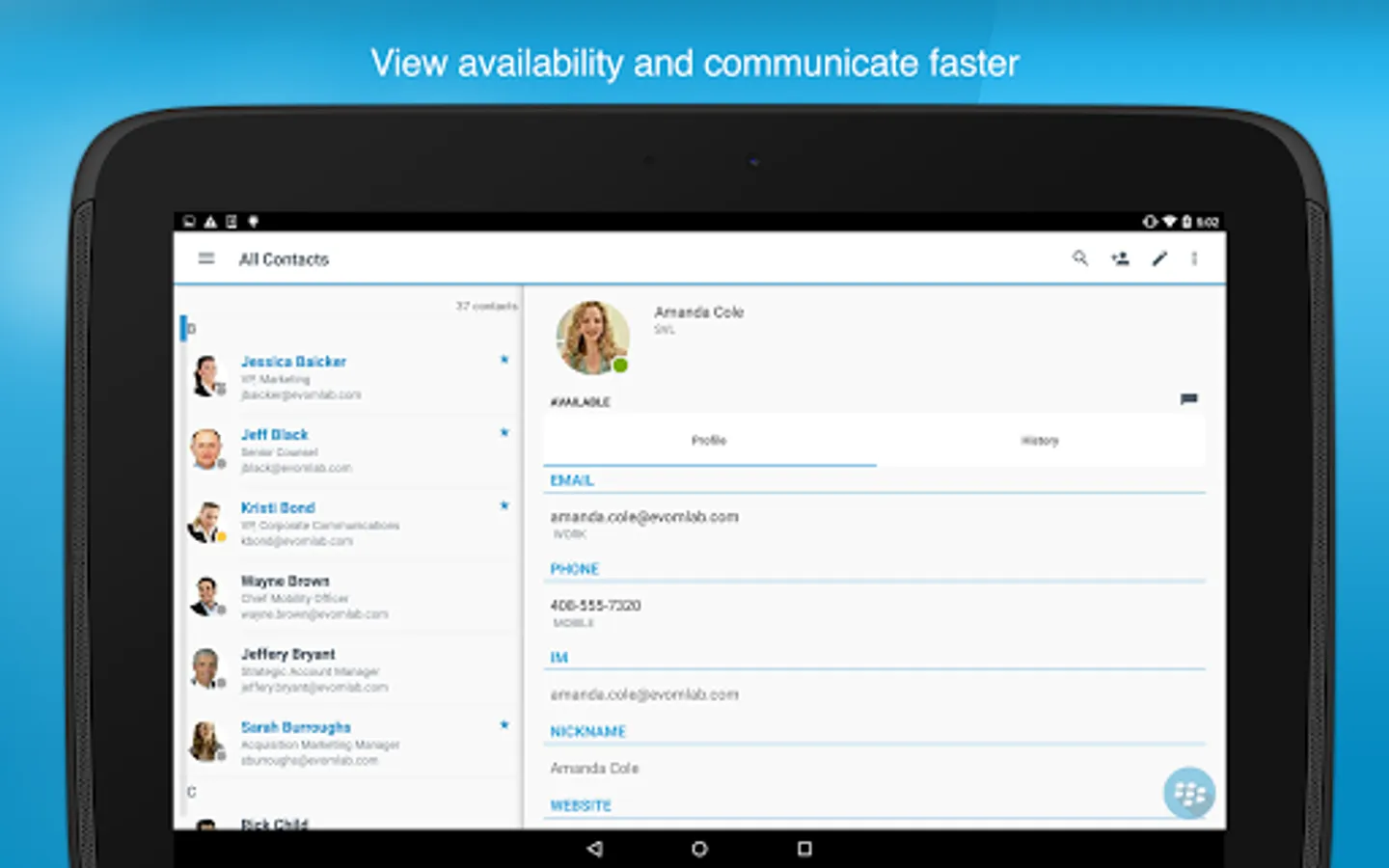 • People centric collaboration: Choose the best way to reach your colleagues based on their online availability status. Initiate a call, an email, an IM or an SMS from within the app them based on their availability.