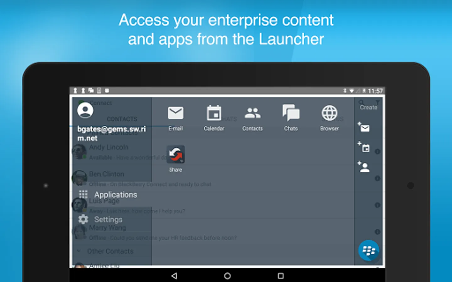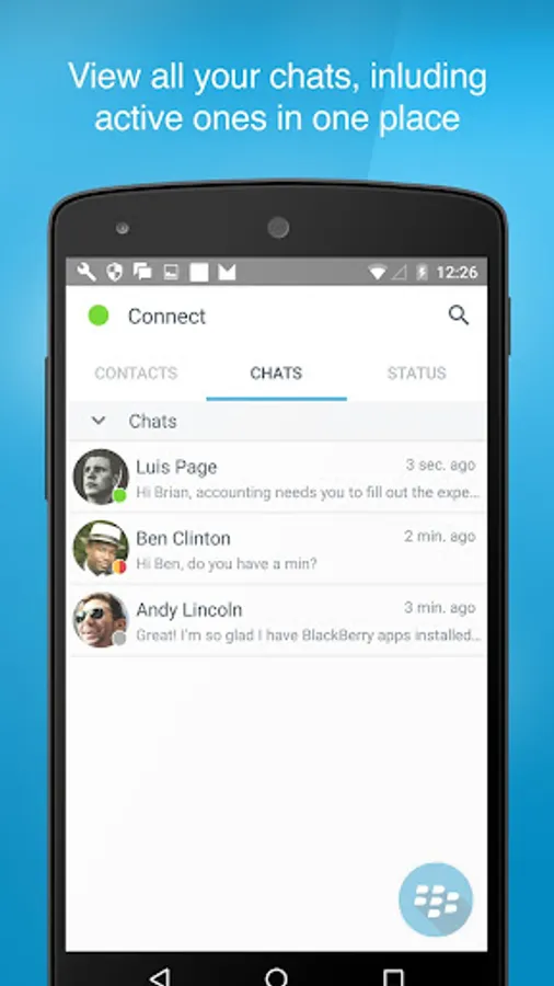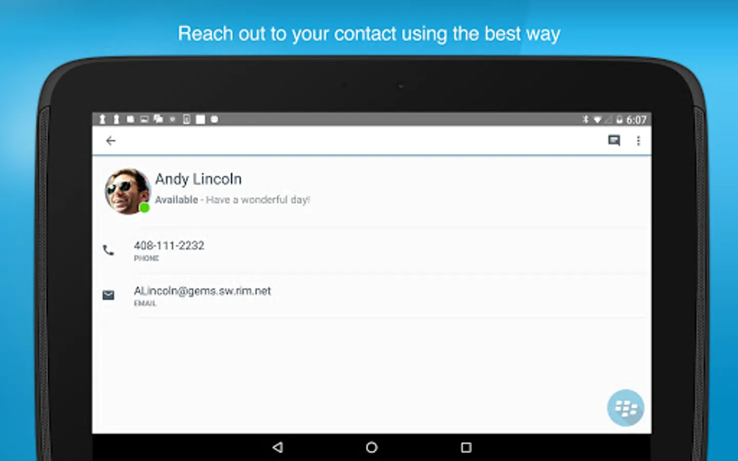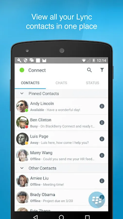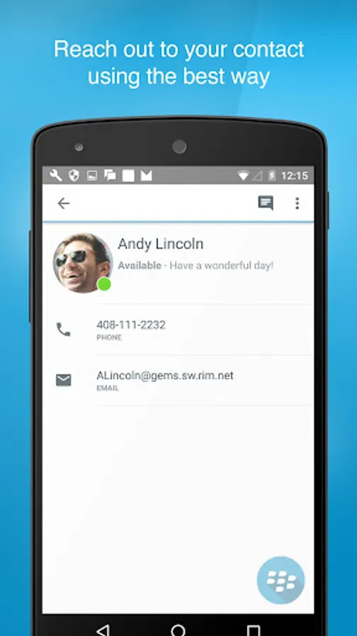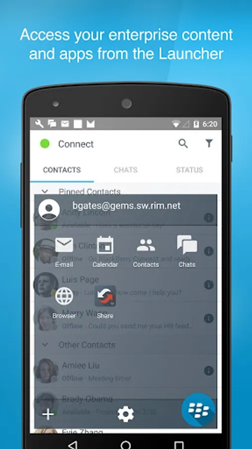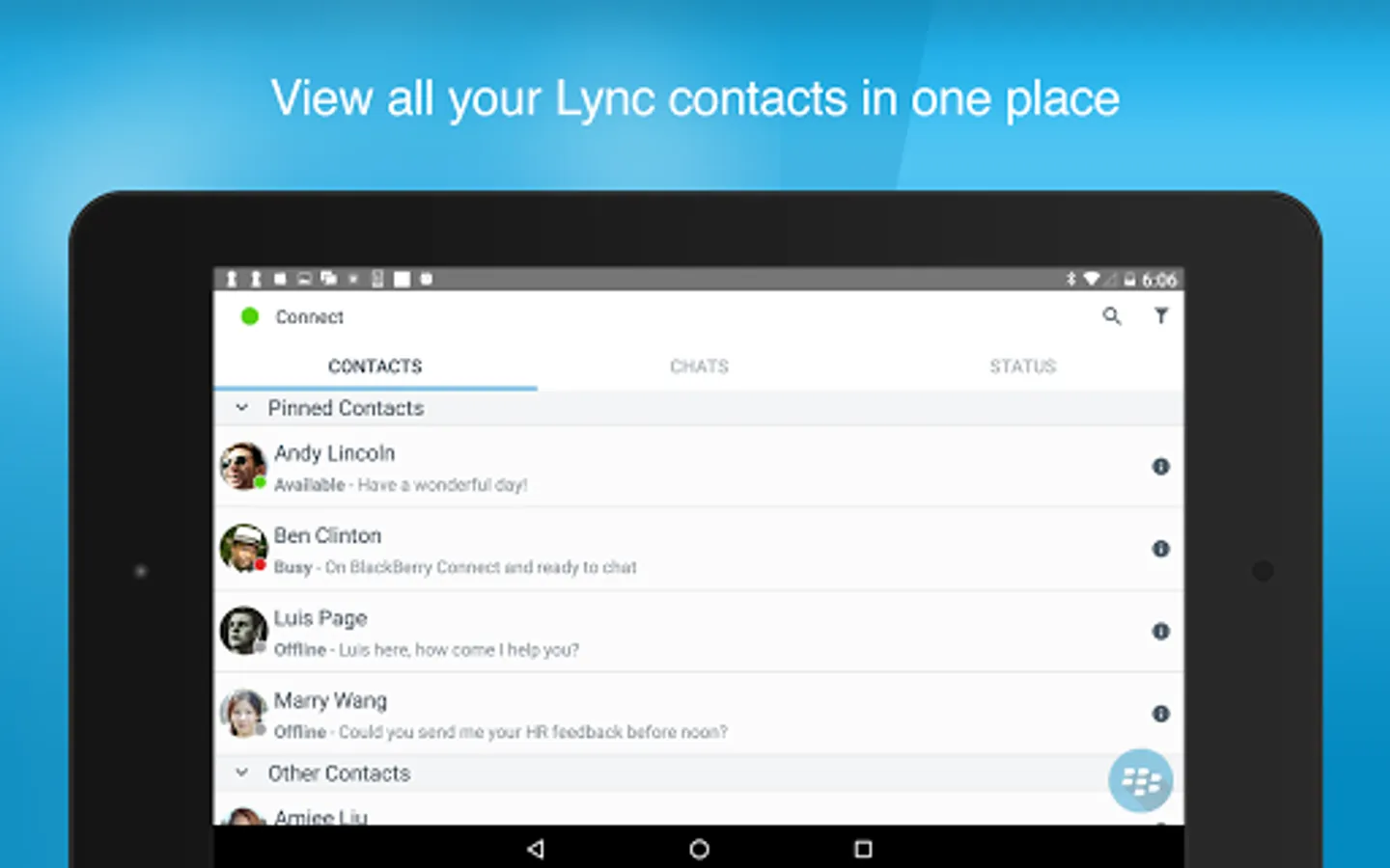 BlackBerry Connect™ is an enterprise instant message (IM) and presence application that improves communication and collaboration while simultaneously protecting corporate data and respecting employee privacy. BlackBerry Connect extends corporate instant messaging platforms like Microsoft Lync, OCS and Sametime to market leading mobile devices without requiring a VPN, firewall holes or servers in the DMZ. It provides instant messaging, presence, and corporate directory lookup from an easy-to-use interface.