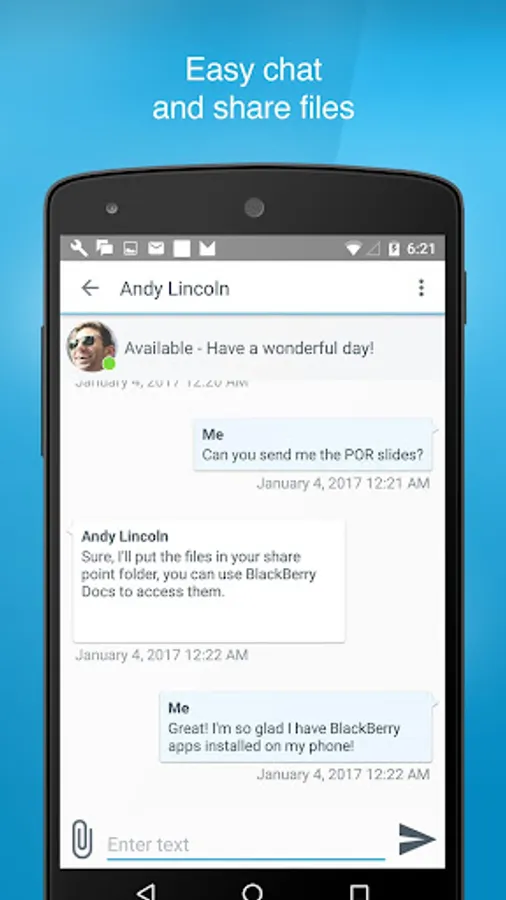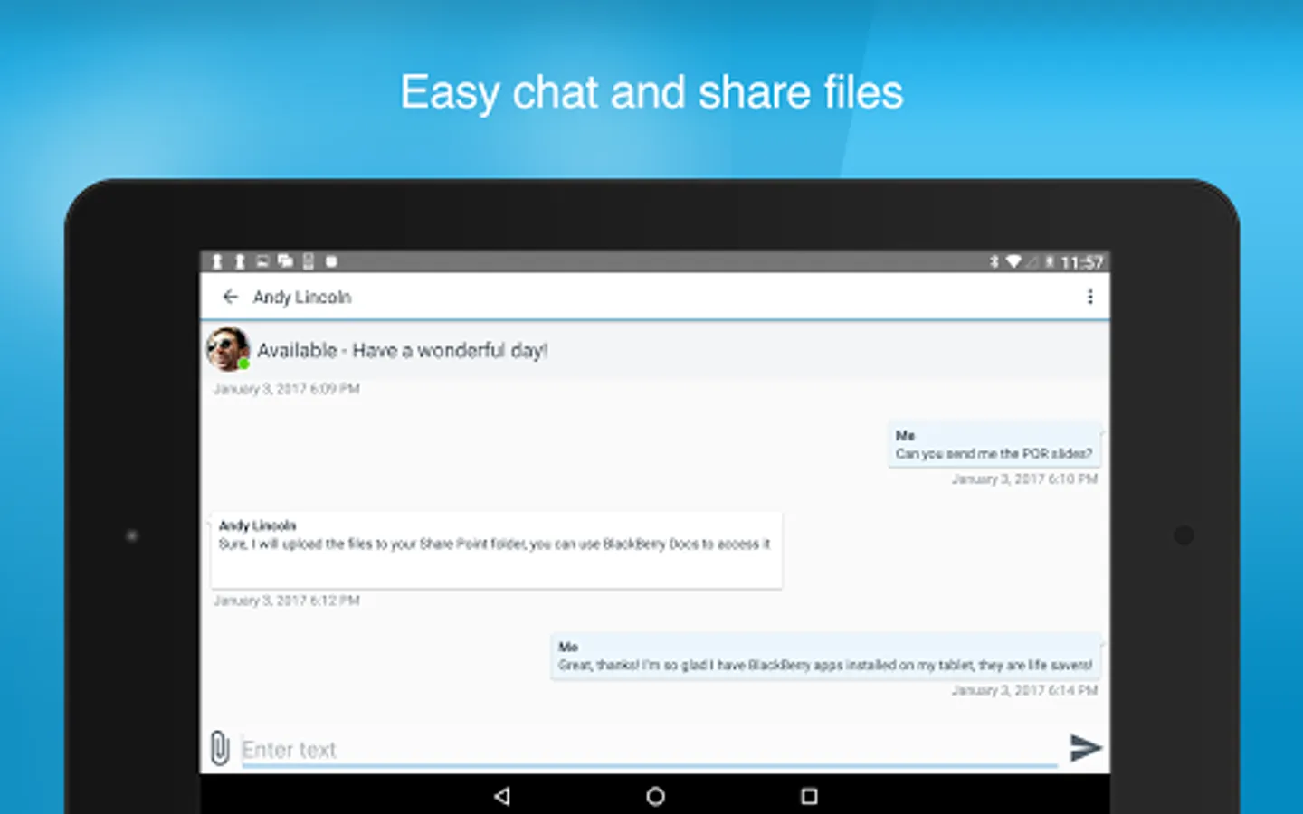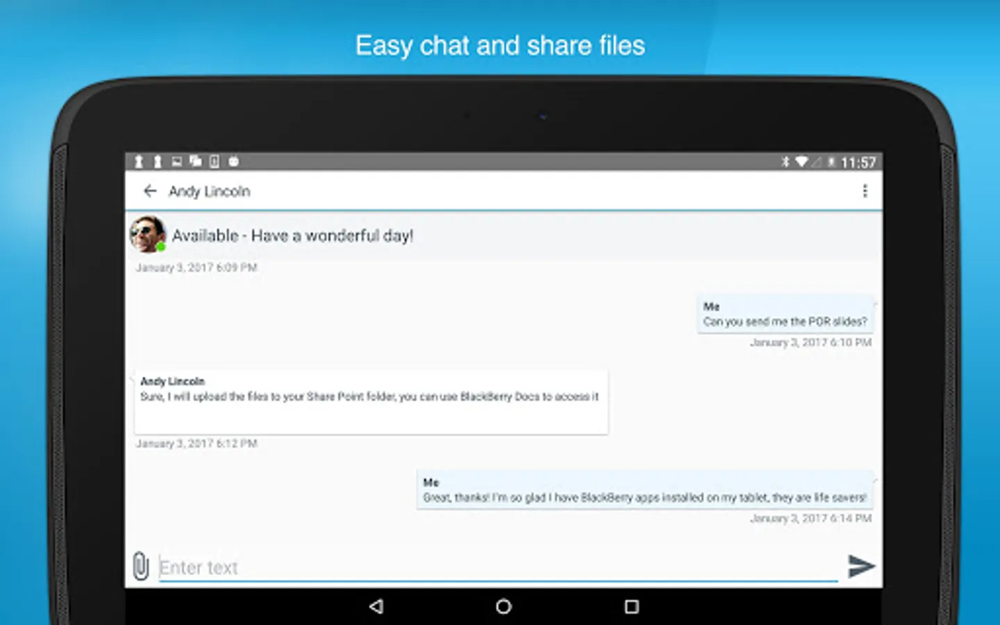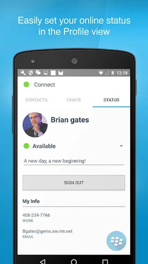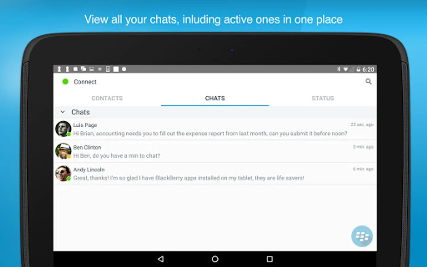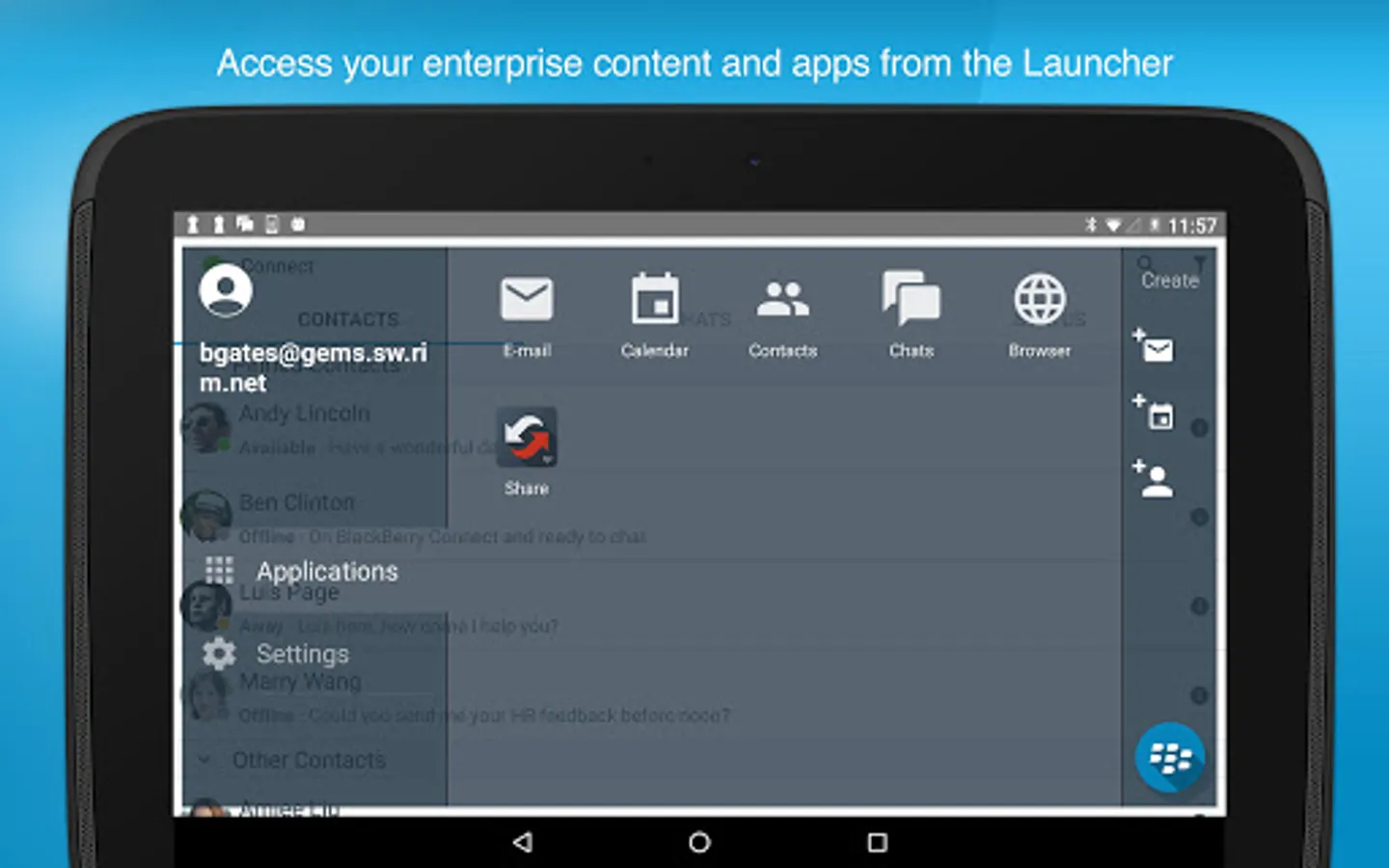 BlackBerry Connect™ is an enterprise instant message (IM) and presence application that improves communication and collaboration while simultaneously protecting corporate data and respecting employee privacy. BlackBerry Connect extends corporate instant messaging platforms like Microsoft Lync, OCS and Sametime to market leading mobile devices without requiring a VPN, firewall holes or servers in the DMZ. It provides instant messaging, presence, and corporate directory lookup from an easy-to-use interface.