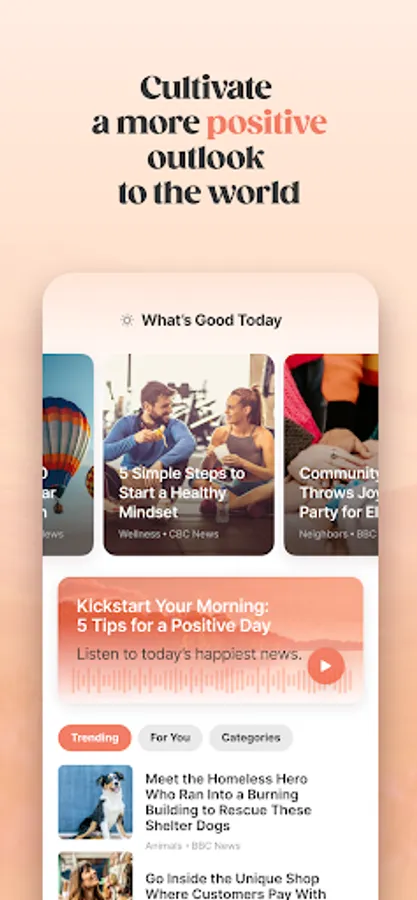 - Personalized feed, customized specifically for you, based on the topics and stories you care about the most to keep you positive, calm and focused throughout the day.