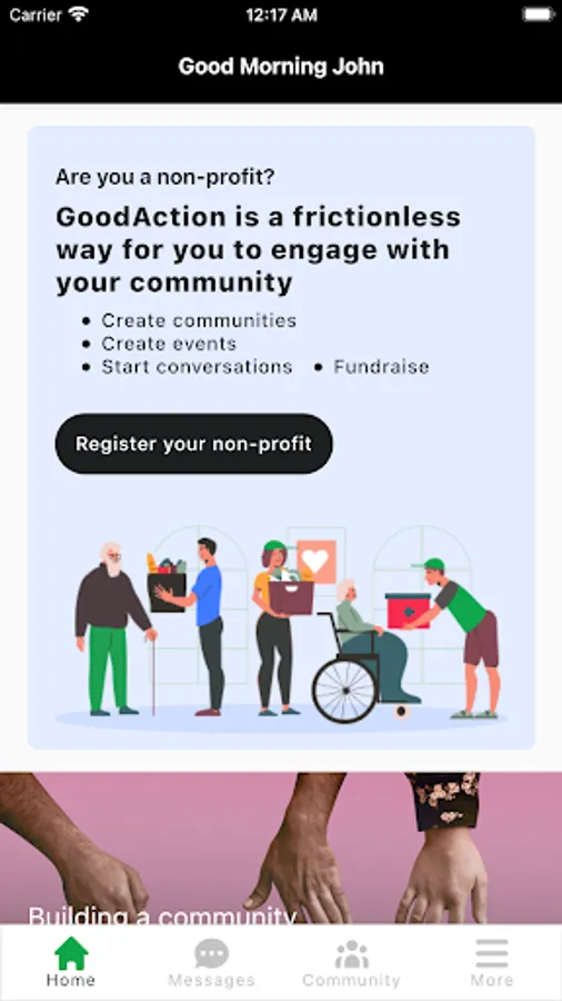 GoodAction is for givers, those in need, and community developers, a platform that facilitates connections and donation of goods and services because it enables continuous two-way engagement that results in a functional and well knitted community.