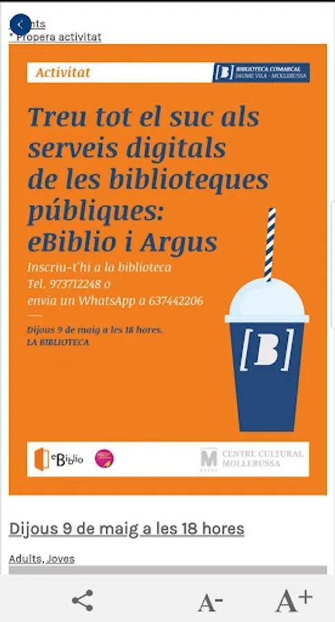 It allows you to consult the catalog of the Public Reading System of Catalonia, manage your Argus account and access BiblioDigital (electronic book download platform. You can also consult the agenda of activities and be informed of the latest news and information regarding the library.